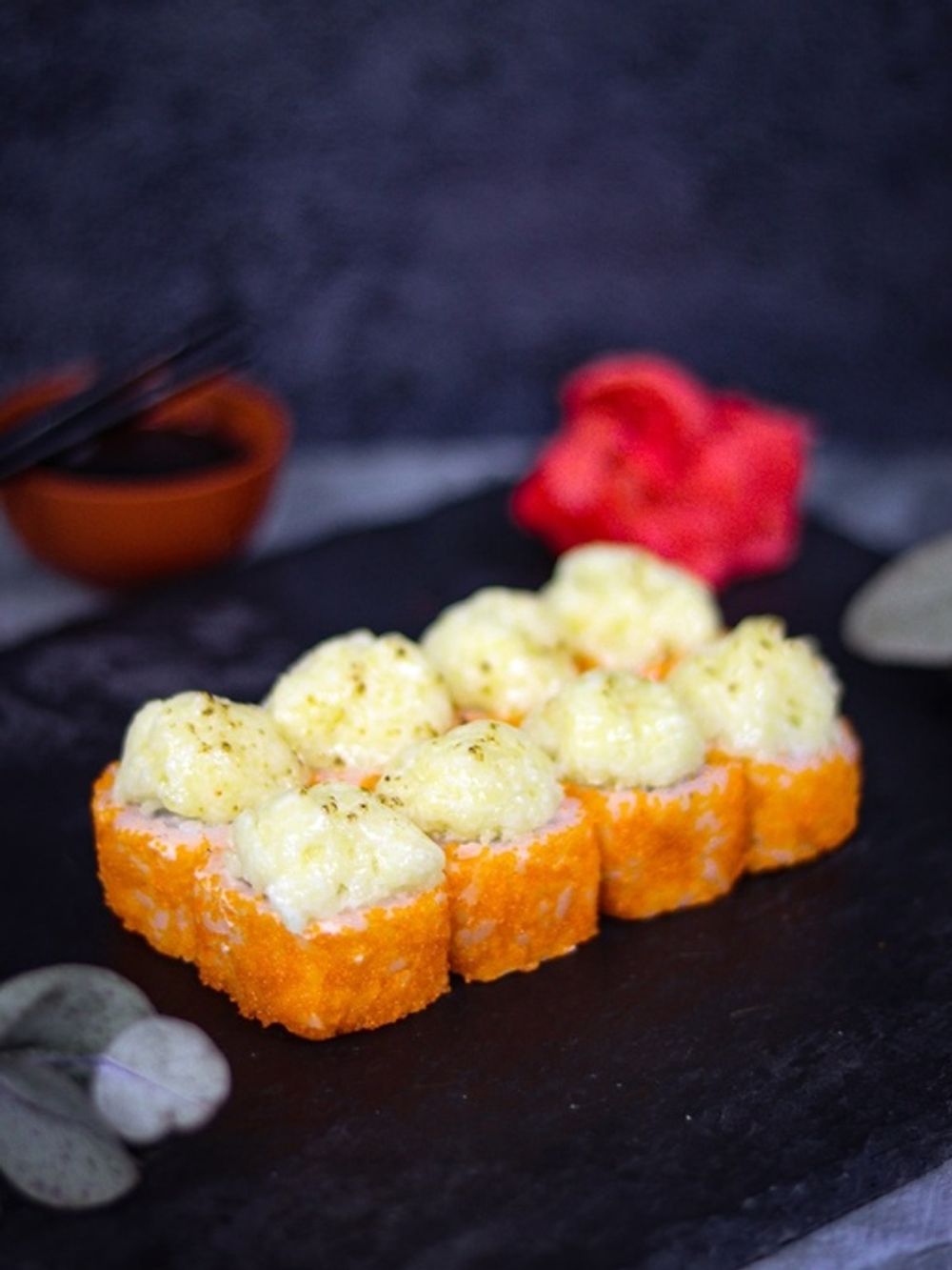 Рис, краб, огурец, масаго, сырный соус(250гр)