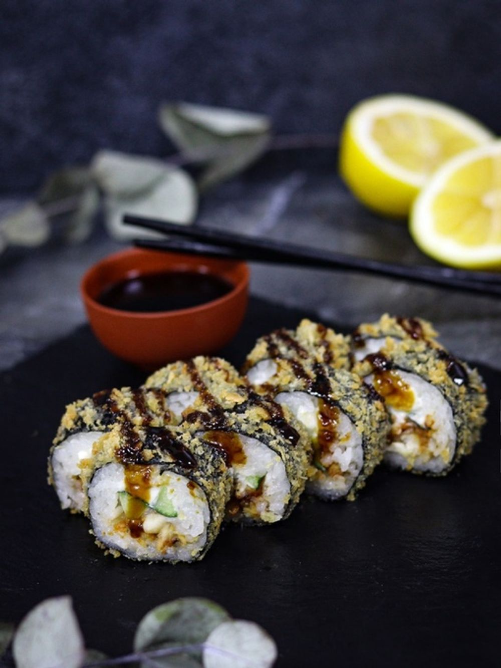 Рис, сыр, угорь, авокадо, унаги соус сверху, мука, сухари(250гр)