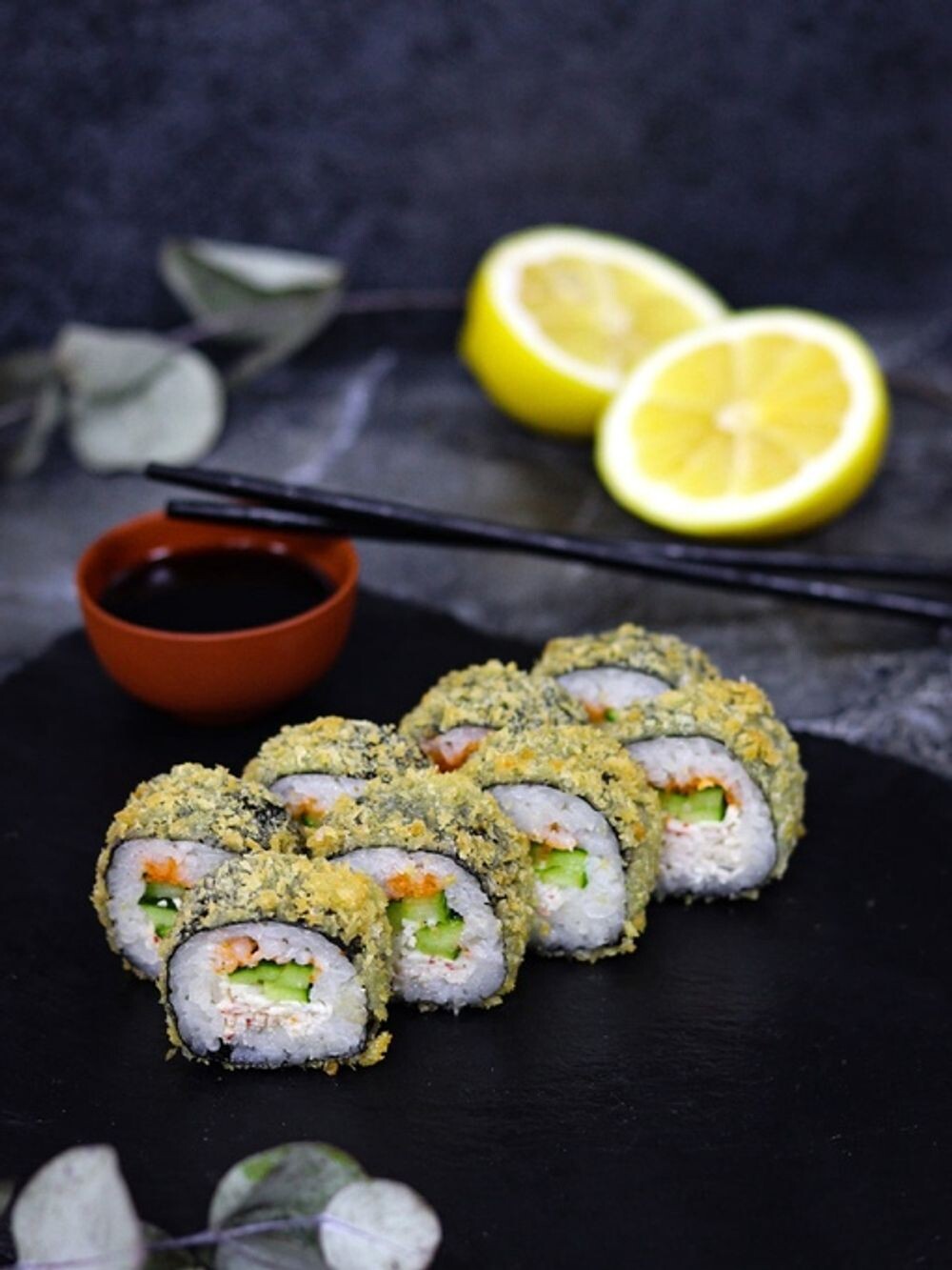 Рис, краб, огурец, авокадо, красный масаго, мука, сухари(250гр)