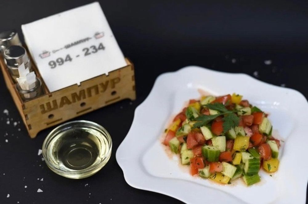 Легкий салат из свежих овощей(помидор,огурец,болгарский перец,лук,чеснок и зелень),заправка из масла или майонеза 250гр