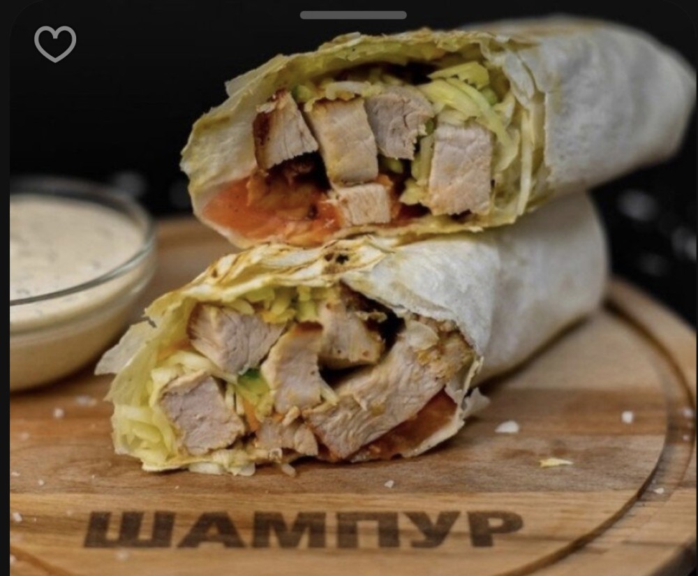 Свиной шашлык,обжаренный на углях, Жареная картошка,сырный лаваш,огурцы,томаты,морковь,капуста, Фирменный белый соус,гранатовый соус.