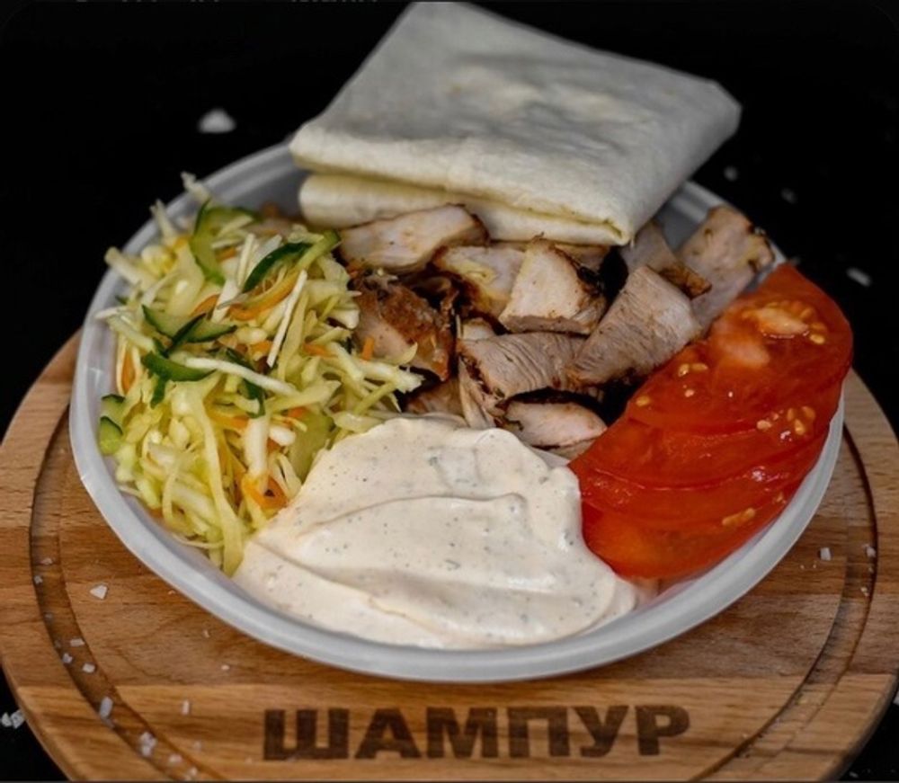 Шашлык свиной, лаваш, огурцы, томаты, морковь, капуста, фирменный белый соус(380гр)