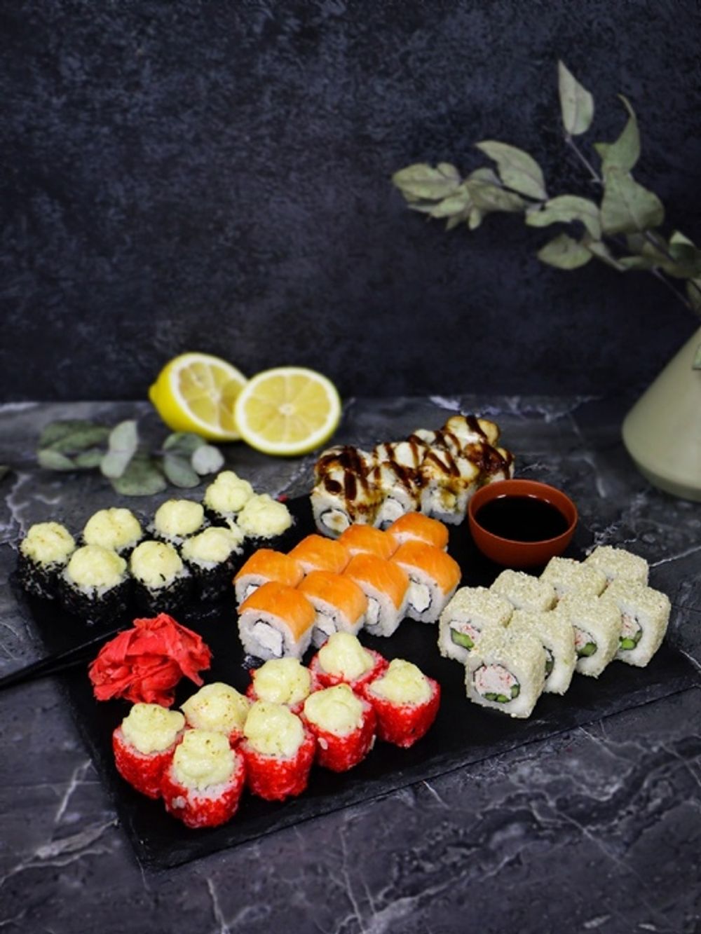 Ролл «Цезарь запеченный», ролл «Унаги лайт», ролл «Фила лайт», ролл «Яки эби», ролл «Калифа лайт»(1150гр)